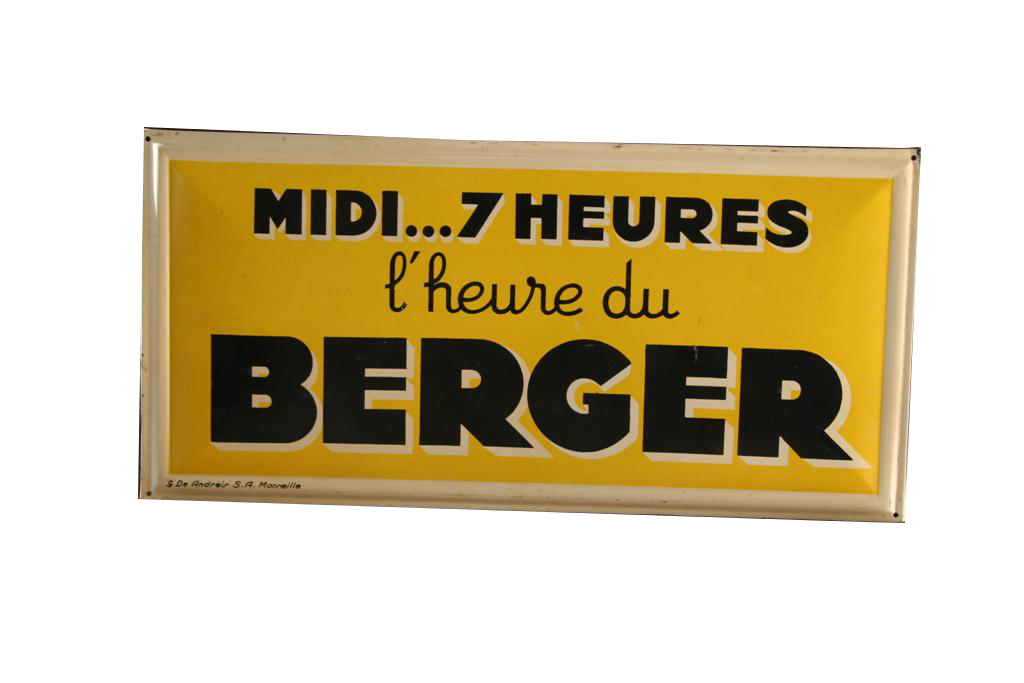 Insegna pubblicitarie in metallo Berger, midi.. 7 heures, l'here du Berger.