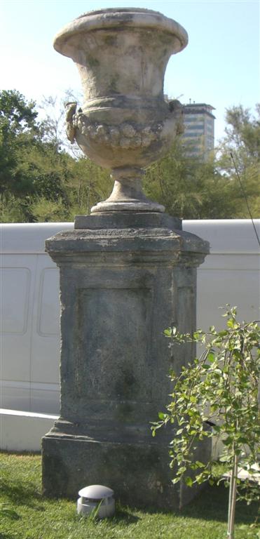 Grande vaso scenografico in polistirolo finto marmo con basamento in legno in stile romanico.
