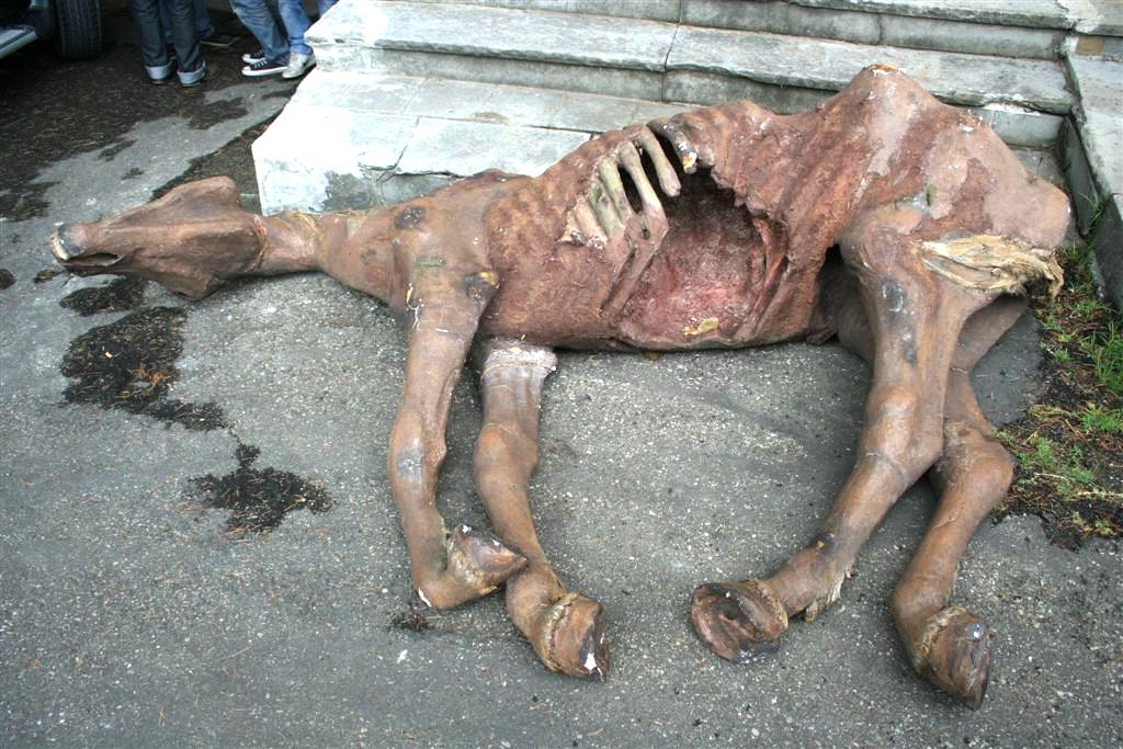 Oggetto di scena teatrale raffigurnte un cavallo agonizzante.