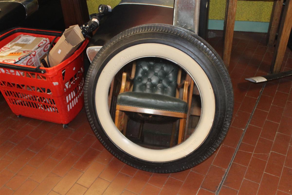 Specchio rotondo creato con ruota completa di auto americana anni '50.