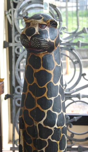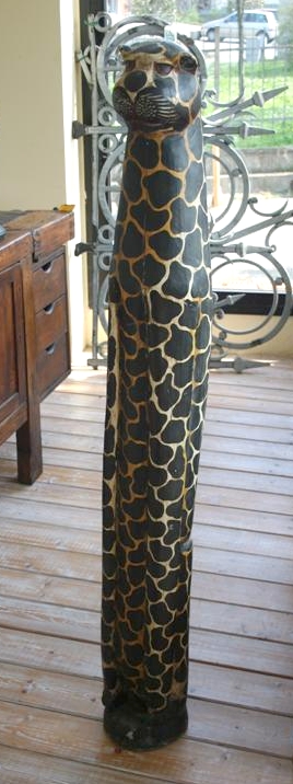 Statua in legno raffigurante un leopardo stilizzato.